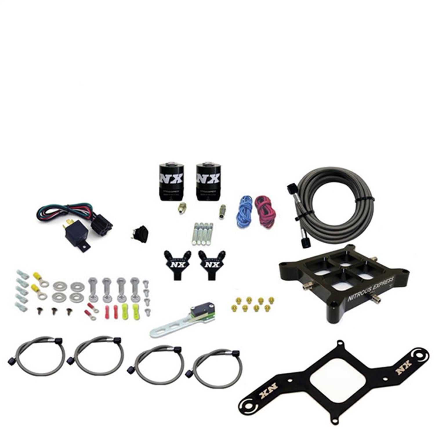 The new NX Billet Crossbar nitrous plate systems have just raised the bar in nitrous plate technology. The CNC machined design eliminates round spray bars resulting in excellent atomization and cylinder distribution. With no spray bars to sag, rotate or disrupt airflow, this is truly the Next Generation in cross bar nitrous plate technology. This crossbar nitrous system includes more than the standard crossbar nitrous kit. It includes a custom solenoid bracket, billet aluminum y fittings, braided stainless solenoid to plate lines, nickel plated fittings, wide open throttle switch, master arming switch, 40 Amp relay and relay harness. This system is designed for 4150 flange manifolds and includes jetting for 50, 100, 150, 200, 250 & 300HP.