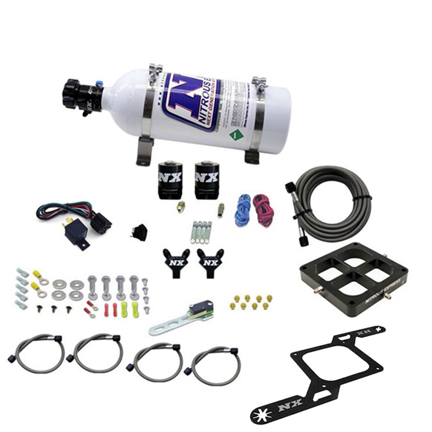 The new NX Billet Crossbar nitrous plate systems have just raised the bar in nitrous plate technology. The CNC machined design eliminates round spray bars resulting in excellent atomization and cylinder distribution. With no spray bars to sag, rotate or disrupt airflow, this is truly the Next Generation in cross bar nitrous plate technology. This system includes a 5lb nitrous bottle with the billet aluminum Lightning 45 bottle valve. This valve not only looks great; It is packed with features including two integrated gauge ports, 5/8 siphon tube, a large .325 orifice and an improved flow path with only one 45 degree turn. The Lightning 45 bottle valve looks great, flows great and weighs nearly one full pound less than our old style brass valve. This crossbar nitrous system includes more than the standard crossbar nitrous kit. It includes a custom solenoid bracket, billet aluminum y fittings, braided stainless solenoid to plate lines, nickel plated fittings, wide open throttle switch, master arming switch, 40 Amp relay and relay harness. This system is designed for DOMINATOR flange manifolds and includes jetting for 50, 100, 150, 200, 250 & 300HP.