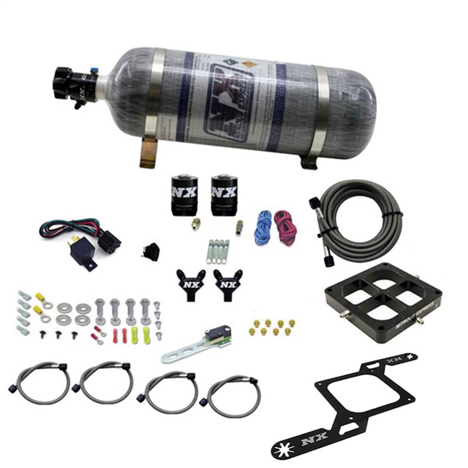 The new NX Billet Crossbar nitrous plate systems have just raised the bar in nitrous plate technology. The CNC machined design eliminates round spray bars resulting in excellent atomization and cylinder distribution. With no spray bars to sag, rotate or disrupt airflow, this is truly the Next Generation in cross bar nitrous plate technology. This system includes a 12lb composite nitrous bottle with the billet aluminum Lightning 45 bottle valve. This valve not only looks great; It is packed with features including two integrated gauge ports, 5/8 siphon tube, a large .325 orifice and an improved flow path with only one 45 degree turn. The Lightning 45 bottle valve looks great, flows great and weighs nearly one full pound less than our old style brass valve. This crossbar nitrous system includes more than the standard crossbar nitrous kit. It includes a custom solenoid bracket, billet aluminum y fittings, braided stainless solenoid to plate lines, nickel plated fittings, wide open throttle switch, master arming switch, 40 Amp relay and relay harness. This system is designed for DOMINATOR flange manifolds and includes jetting for 50, 100, 150, 200, 250 & 300HP.