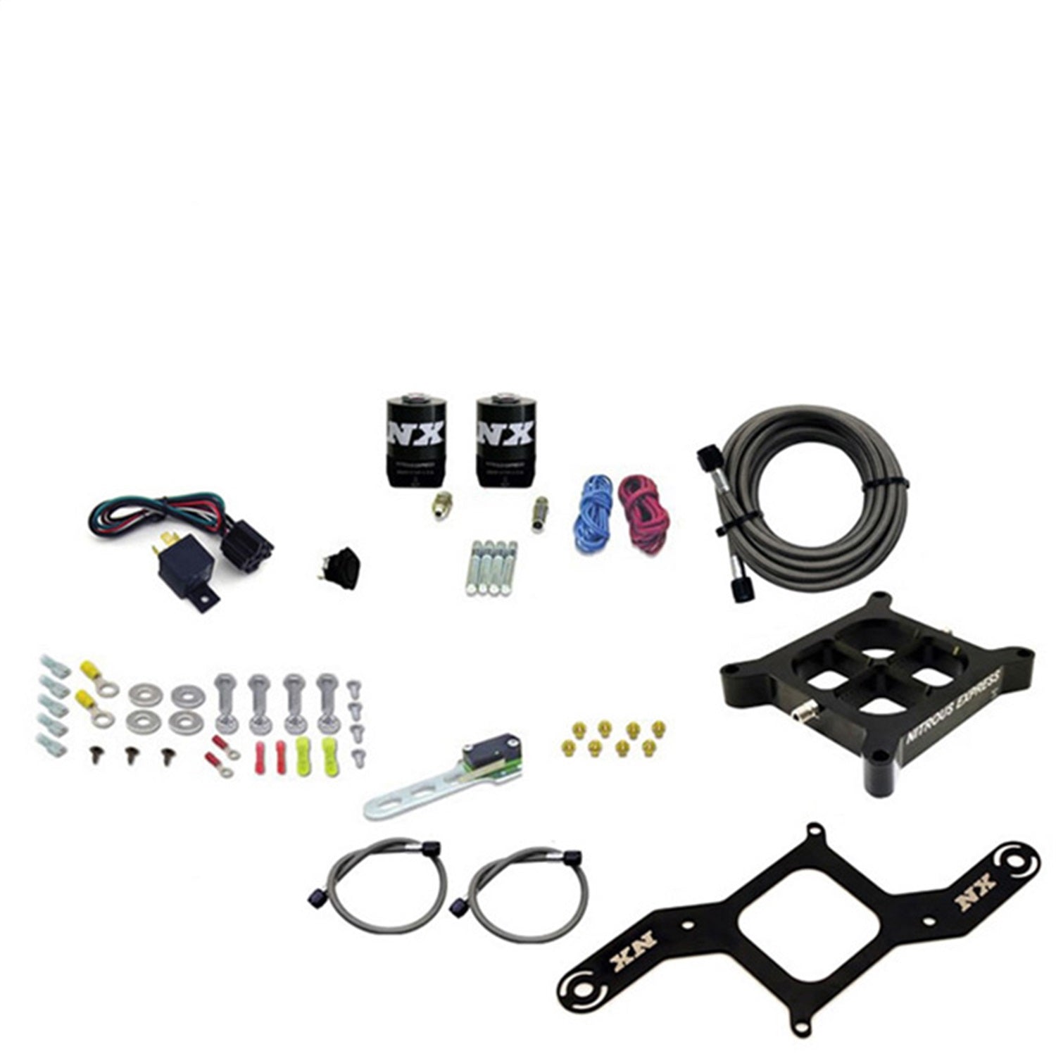 NX Single Entry Billet Crossbar nitrous plate systems provide the crossbar spray pattern that everyone loves in a package that is legal for racing classes that allow only one nitrous and one fuel jet. With no spray bars to sag, rotate or disrupt airflow, this is truly the Next Generation in cross bar nitrous plate technology. This system includes a 10lb nitrous bottle with the billet aluminum Lightning 45 bottle valve. This valve not only looks great; It is packed with features including two integrated gauge ports, 5/8 siphon tube, a large .325 orifice and an improved flow path with only one 45 degree turn. The Lightning 45 bottle valve looks great, flows great and weighs nearly one full pound less than our old style brass valve. This crossbar nitrous system includes more than the standard crossbar nitrous kit. It includes a custom solenoid bracket, High flow braided stainless solenoid to plate lines, nickel plated fittings, wide open throttle switch, master arming switch, 40 Amp relay and relay harness. This system is designed for 4150 flange manifolds and includes jetting for 50, 100, 150, 200, 250 and 300HP
