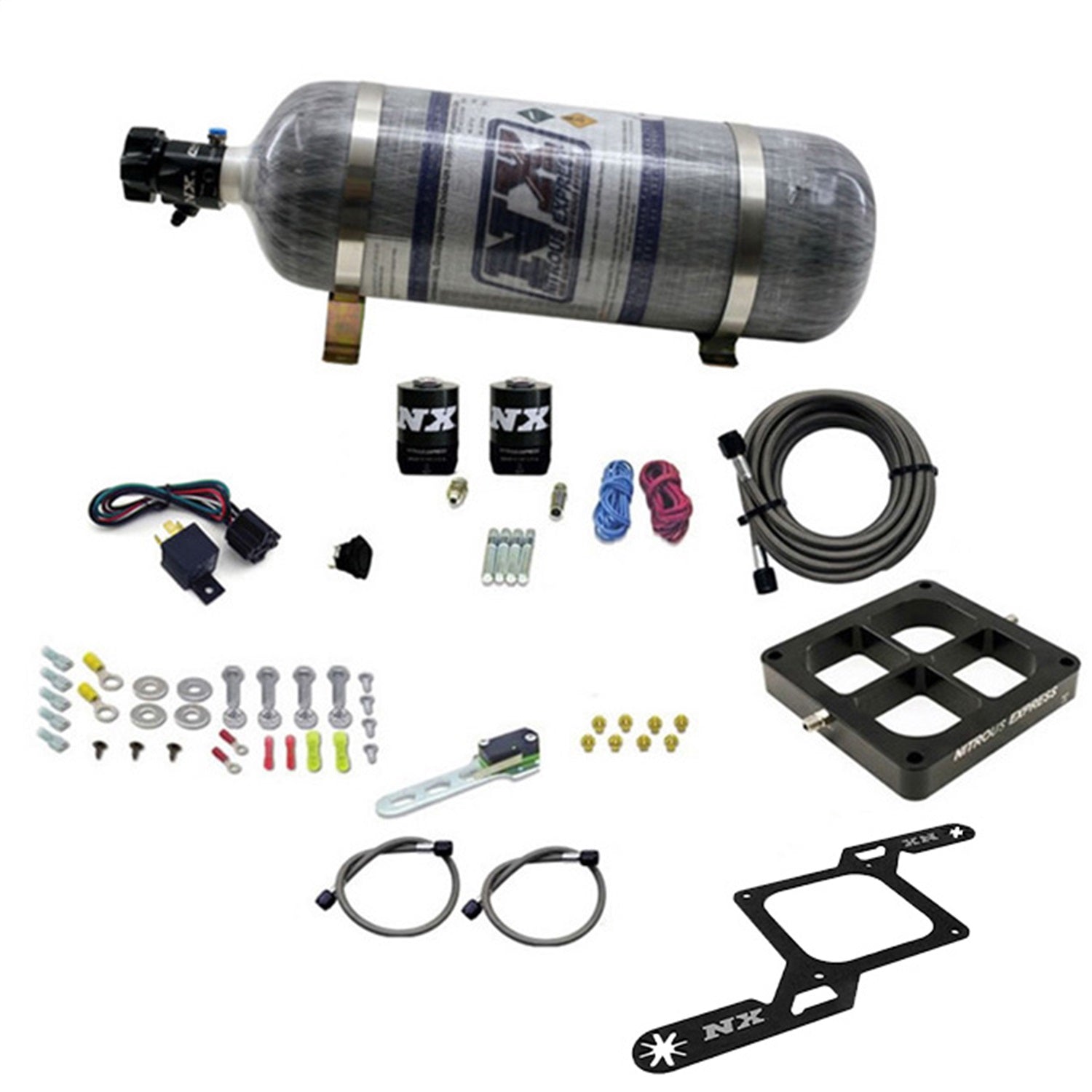 The new NX Billet Crossbar nitrous plate systems have just raised the bar in nitrous plate technology. The CNC machined design eliminates round spray bars resulting in excellent atomization and cylinder distribution. With no spray bars to sag, rotate or disrupt airflow, this is truly the Next Generation in cross bar nitrous plate technology. This system includes a 15lb nitrous bottle with the billet aluminum Lightning 45 bottle valve. This valve not only looks great; It is packed with features including two integrated gauge ports, 5/8 siphon tube, a large .325 orifice and an improved flow path with only one 45 degree turn. The Lightning 45 bottle valve looks great, flows great and weighs nearly one full pound less than our old style brass valve. This crossbar nitrous system includes more than the standard crossbar nitrous kit. It includes a custom solenoid bracket, billet aluminum y fittings, braided stainless solenoid to plate lines, nickel plated fittings, wide open throttle switch, master arming switch, 40 Amp relay and relay harness. This system is designed for 4150 flange manifolds and includes jetting for 50, 100, 150, 200, 250 & 300HP.