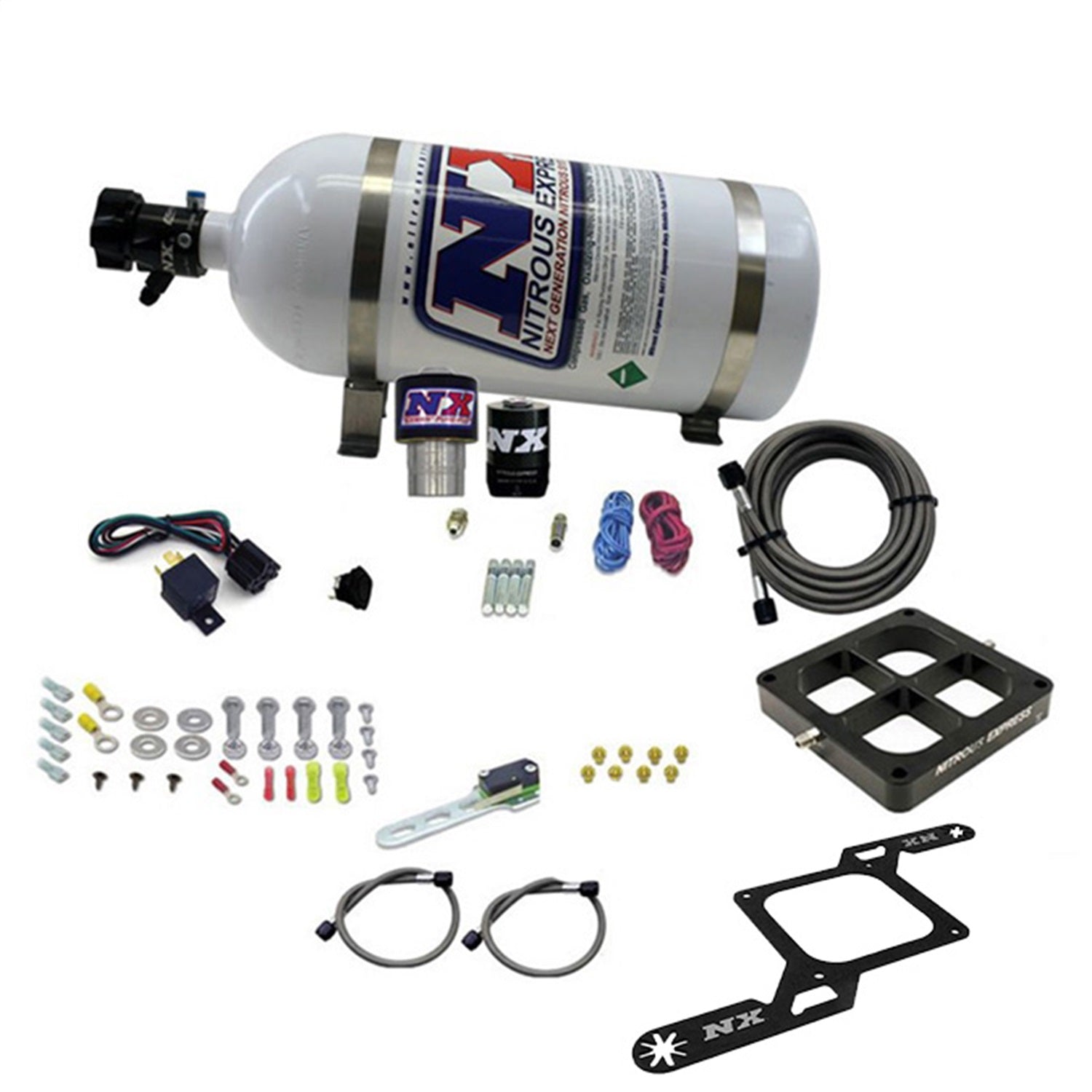 NX Single Entry Billet Crossbar nitrous plate systems provide the crossbar spray pattern that everyone loves in a package that is legal for racing classes that allow only one nitrous and one fuel jet. With no spray bars to sag, rotate or disrupt airflow, this is truly the Next Generation in cross bar nitrous plate technology. This system includes a 10lb nitrous bottle with the billet aluminum Lightning 500 bottle valve. This valve not only looks great; It is packed with features including two integrated gauge ports, 5/8 siphon tube, a large .500 orifice and an improved flow path with only one 45 degree turn. The Lightning bottle valve looks great, flows great and weighs nearly one full pound less than our old style brass valve.This system is designed for 4500 flange manifolds and includes: This system is designed for 4500 flange manifolds and includes: 15178 (.178 in.) Nitrous and 15301L Fuel Lightning Solenoids Custom solenoid bracket High flow braided stainless solenoid to plate lines nickel plated fittings wide open throttle switch 6AN Feedline Master arming switch Amp relay and relay harness Jetting for 250-650HP