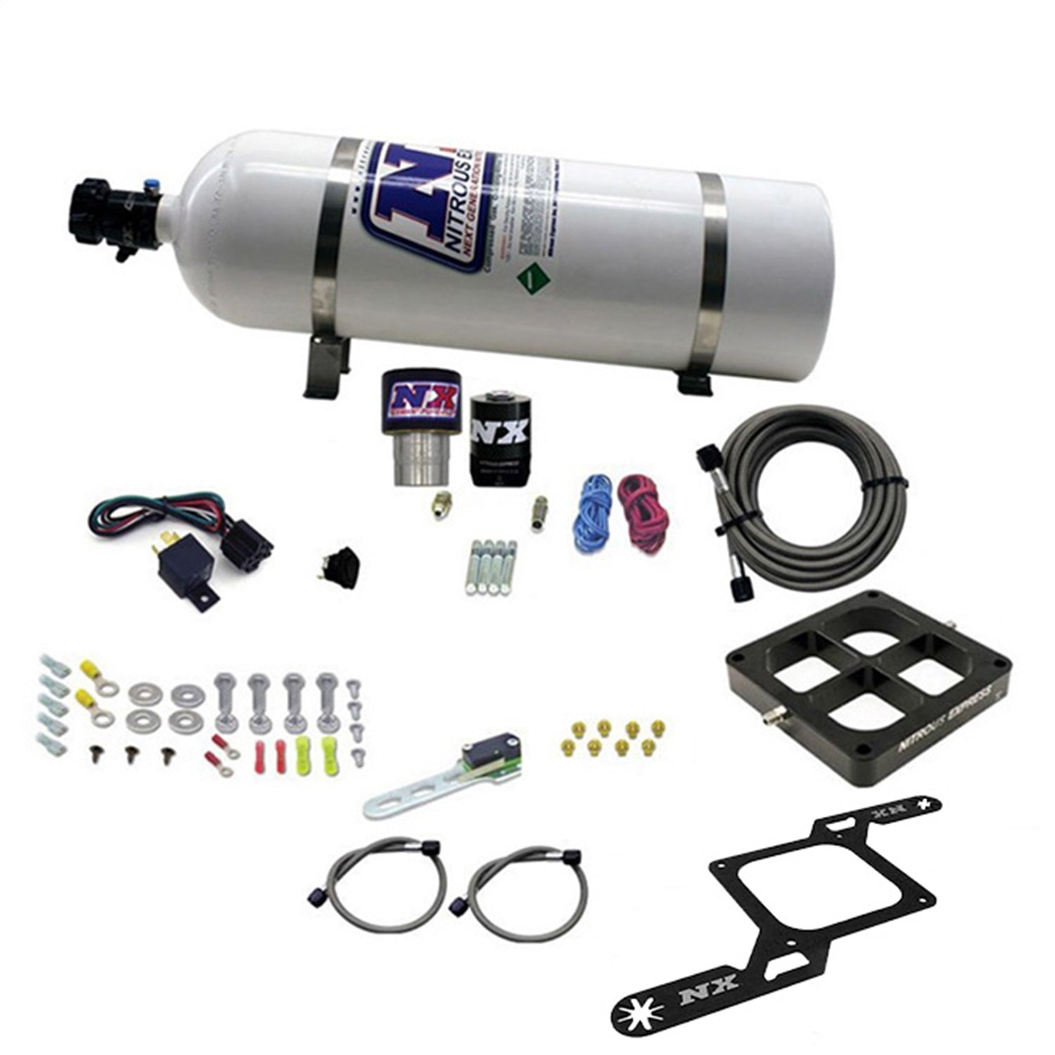 NX Single Entry Billet Crossbar nitrous plate systems provide the crossbar spray pattern that everyone loves in a package that is legal for racing classes that allow only one nitrous and one fuel jet. With no spray bars to sag, rotate or disrupt airflow, this is truly the Next Generation in cross bar nitrous plate technology. This system includes a 10lb nitrous bottle with the billet aluminum Lightning 500 bottle valve. This valve not only looks great; It is packed with features including two integrated gauge ports, 5/8 siphon tube, a large .500 orifice and an improved flow path with only one 45 degree turn. The Lightning bottle valve looks great, flows great and weighs nearly one full pound less than our old style brass valve.This system is designed for 4500 flange manifolds and includes: This system is designed for 4500 flange manifolds and includes: 15178 (.178 in.) Nitrous and 15301L Fuel Lightning Solenoids Custom solenoid bracket High flow braided stainless solenoid to plate lines nickel plated fittings wide open throttle switch 6AN Feedline Master arming switch Amp relay and relay harness Jetting for 250-650HP